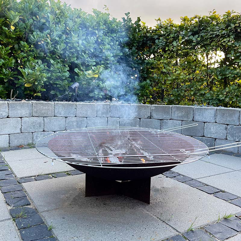 Fehlt Ihnen ein Rost für Ihre Feuerstelle? Wir haben ein Modell, das perfekt zu dieser Feuerstelle passt. Sehen Sie es hier:Halber Grillrost für Feuerstelle Ø70 cm