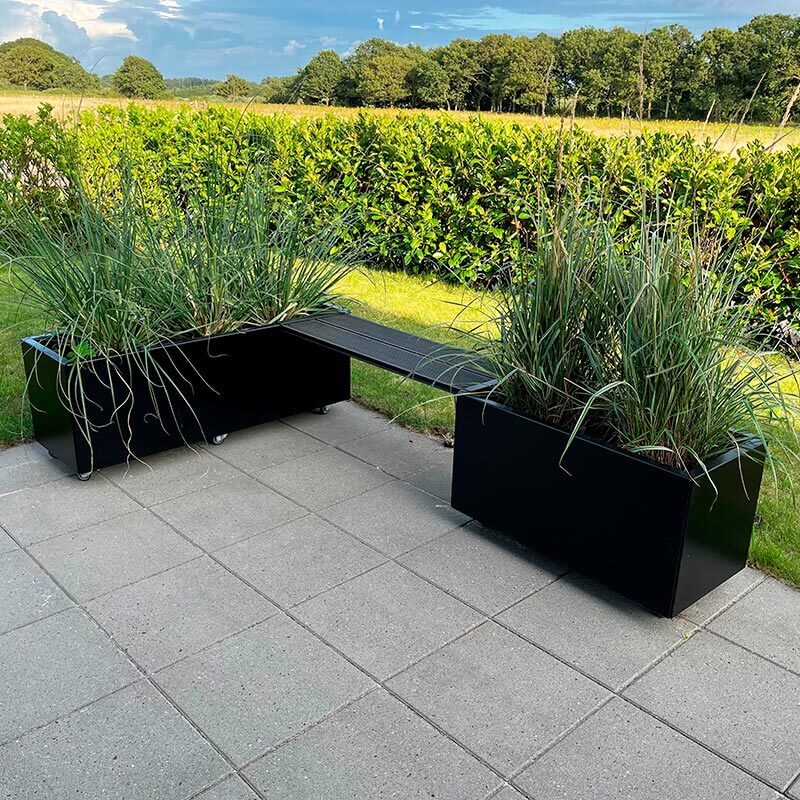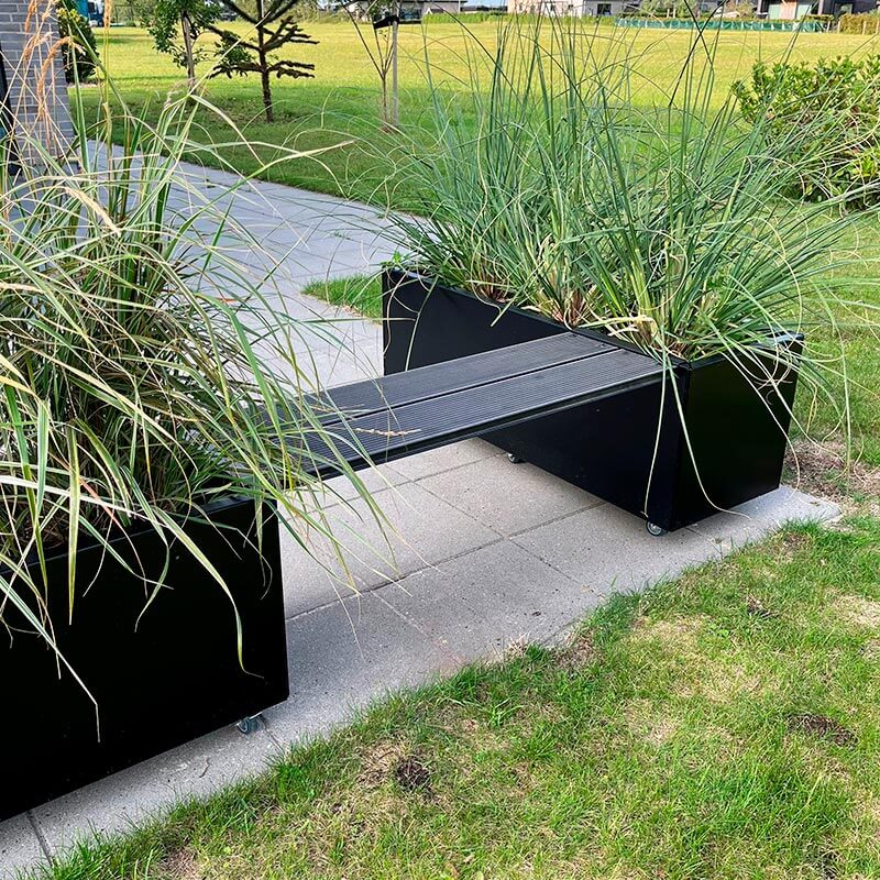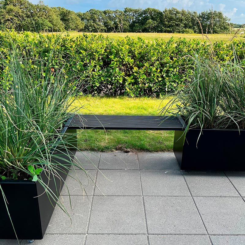 Stilvolle Bank aus wartungsfreiem Verbundwerkstoff, geeignet für den Einsatz zwischen unseren Hochbeeten der THOR-Serie.