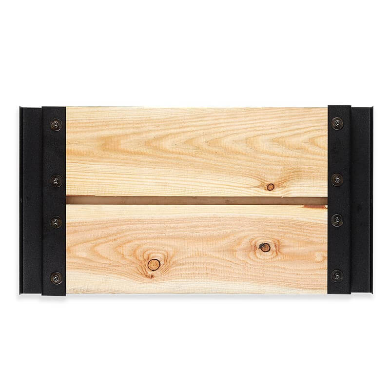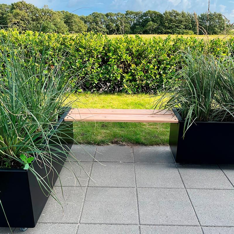 Stilvolle Sitzbank aus naturbelassenem Lärchenholz, passend zum Einsatz zwischen unseren Hochbeeten der Serie THOR.