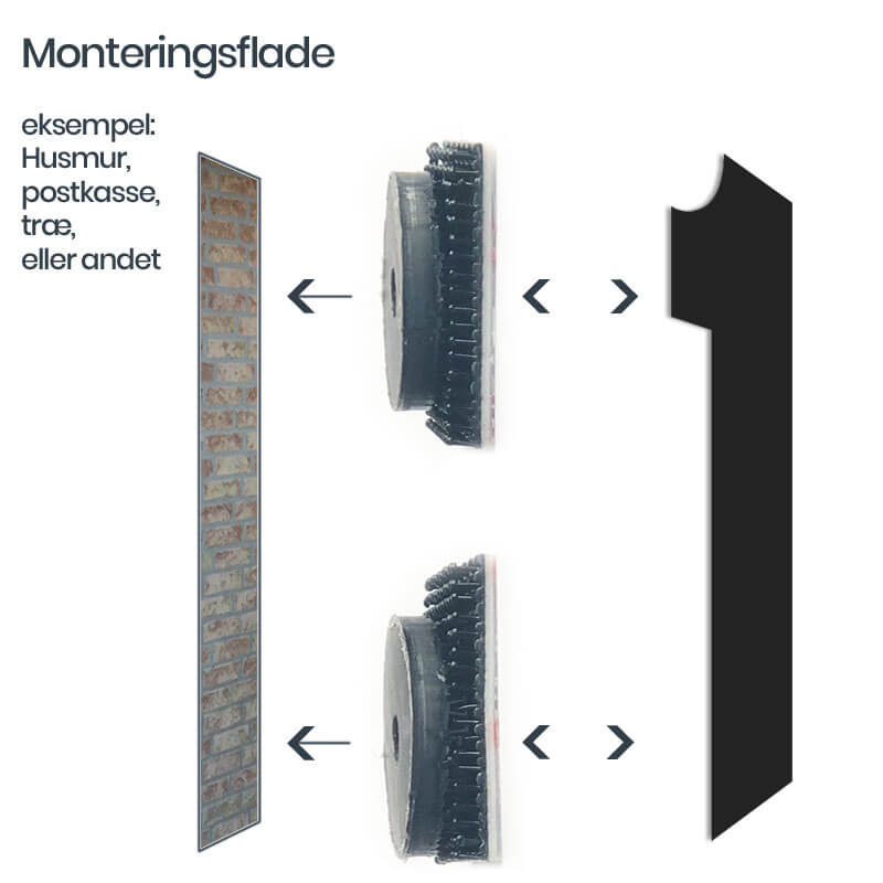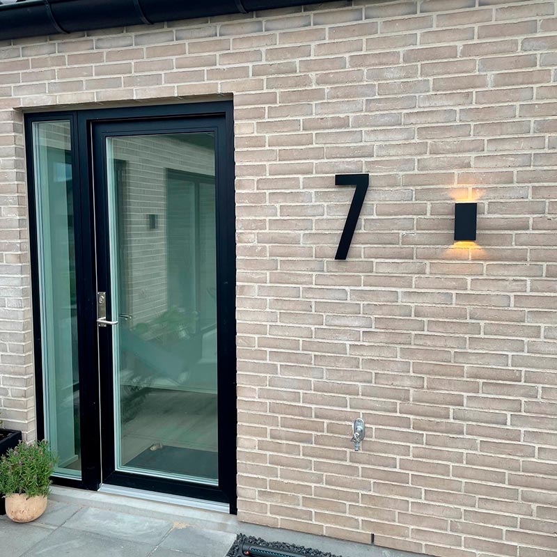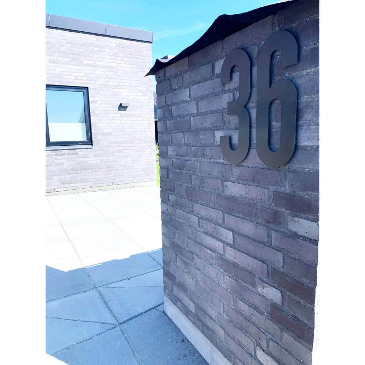 Sie können Bilder aller Zahlen von 0 bis 9 sehen, sodass Sie sich ein Bild davon machen können, wie eine schwarze Hausnummer an Ihrem Haus aussehen würde. Der Ziegelstein auf dem geteilten Bild stammt von Randers Tegl und heißt RT473.