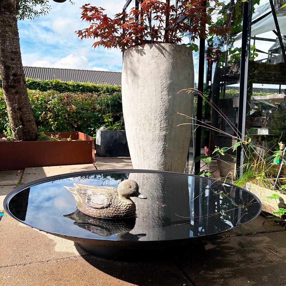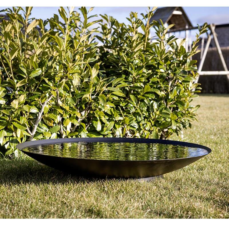 Hier erhalten Sie ein wunderschönes Spiegelbecken in robuster Qualität, welches schwarz pulverbeschichtet ist. Es eignet sich auch hervorragend als Vogelbad für Gartenvögel.